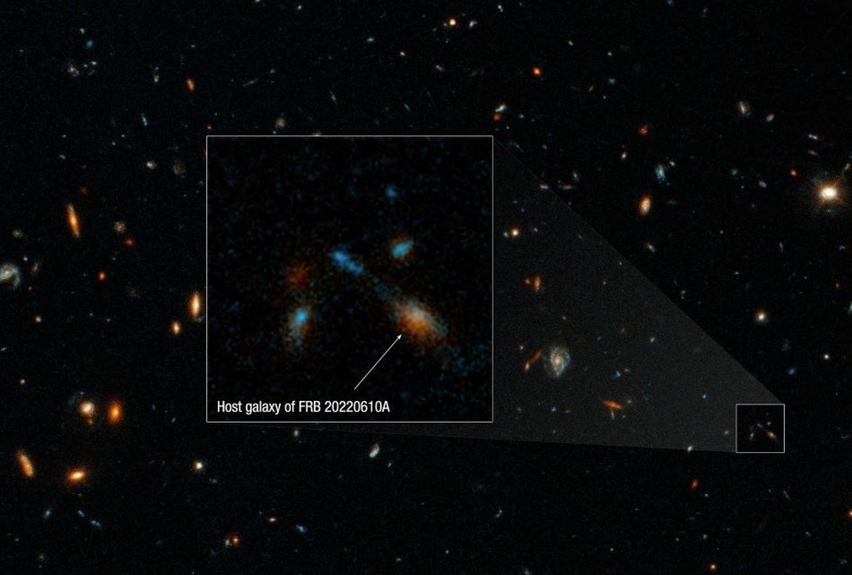 Imágenes del Telescopio Espacial Hubble han permitido rastrear la señal de radio FRB (Fast Radio Burst) más potente registrada, en verano de 2022, hasta un grupo de al menos siete galaxias.