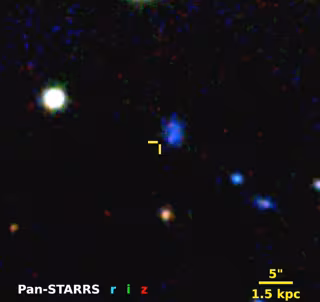 Imágenes de preexplosión de la galaxia anfitriona obtenidas por Pan-STARRS. Las retículas amarillas tienen una longitud de 1'' (0,3 kpc) y marcan la ubicación de SN 2023ufx. - TUCKER ET AL./THE ASTROPHYSICAL JOURNAL