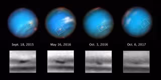 Inmensas tormentas oscuras en Neptuno fueron descubiertas por primera vez a fines de la década de 1980 por la nave espacial Voyager 2 de la NASA. Desde entonces, solo el Hubble ha tenido la nitidez de la luz azul para rastrear estas características elusivas. Hubble descubrió dos tormentas oscuras que aparecieron a mediados de la década de 1990 y luego desaparecieron. Esta última tormenta se vio por primera vez en 2015, pero ahora se está reduciendo.