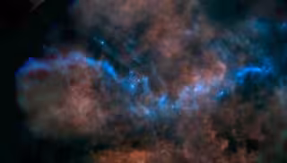 Una de las sorpresas es que las partes más frías de la nube forman filamentos de nubes que se extienden a través de las partes más calientes de la nube. Esta imagen muestra un filamento de nubes frías, conocida por los astrónomos como G82.65-2.00. El filamento azul es la parte más fría de la nube y contiene 800 veces más masa que el Sol. El polvo en este filamento tiene una temperatura de -259ºC. A esta temperatura baja, si el filamento contiene suficiente masa, es probable que colapsará para la formación de estrellas.