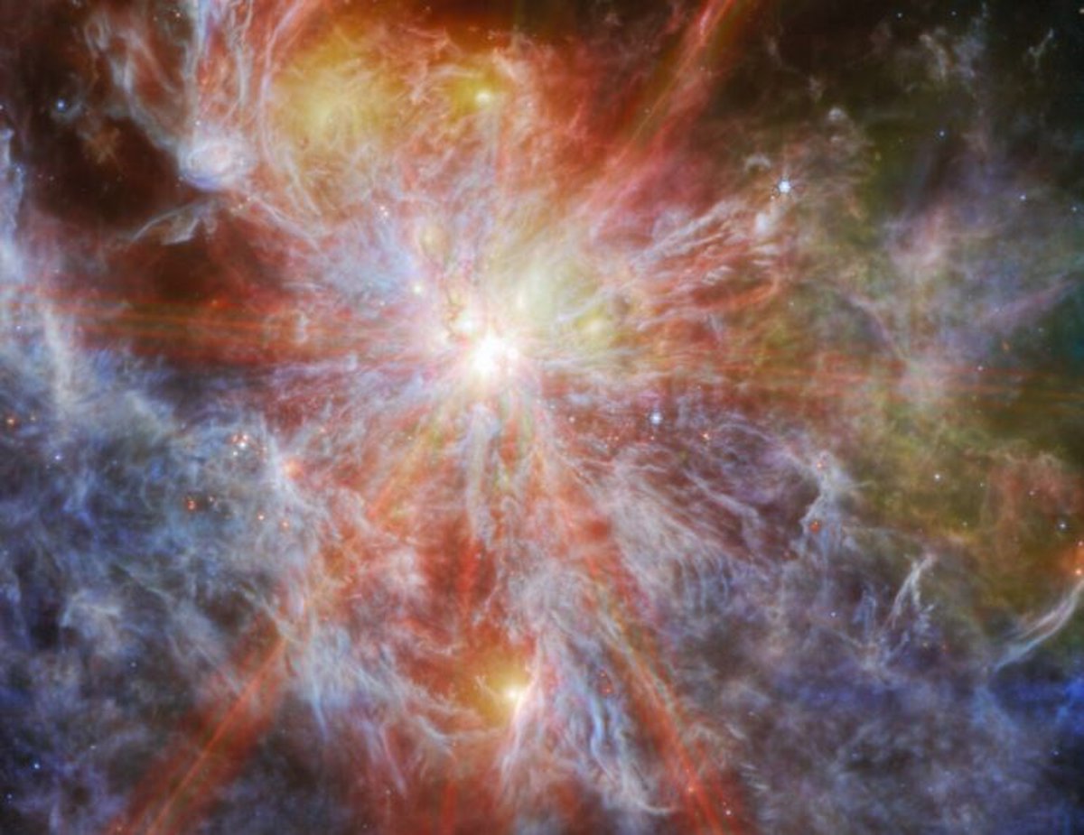 En el caso de Webb, los seis picos de explosión estelar más grandes aparecen debido a la simetría hexagonal de los 18 segmentos del espejo primario de Webb. Patrones como estos sólo se notan alrededor de objetos compactos y muy brillantes, donde toda la luz proviene del mismo lugar. La mayoría de las galaxias, aunque parezcan muy pequeñas a nuestros ojos, son más oscuras y están más dispersas que una sola estrella y, por lo tanto, no muestran este patrón.
