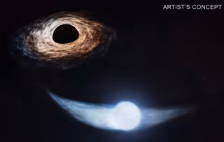Esta impresión artística (arriba) muestra una estrella que ha sido parcialmente perturbada por un agujero negro de este tipo en el sistema conocido como AT2018fyk. El agujero negro supermasivo de AT2018fyk, con una masa de aproximadamente 50 millones de veces la del Sol, se encuentra en el centro de una galaxia ubicada a unos 860 millones de años luz de la Tierra.