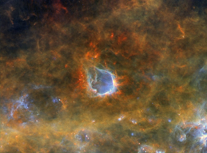 La imagen de RCW 120 cuenta otra historia de la implacable formación estelar: una estrella en el centro, invisible a longitudes de onda infrarrojas, ha soplado una hermosa burbuja alrededor de sí misma con la poderosa presión de la luz que irradia.