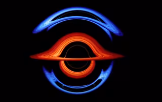 Vistos casi desde el borde, los discos de acreción se ven notablemente más brillantes en un lado. La distorsión gravitacional altera los caminos de la luz provenientes de diferentes partes de los discos, produciendo la imagen deformada. El rápido movimiento del gas cerca del agujero negro modifica la luminosidad del disco a través de un fenómeno llamado impulso Doppler, un efecto de la teoría de la relatividad de Einstein que ilumina el lado que gira hacia el espectador y atenúa el lado que gira.