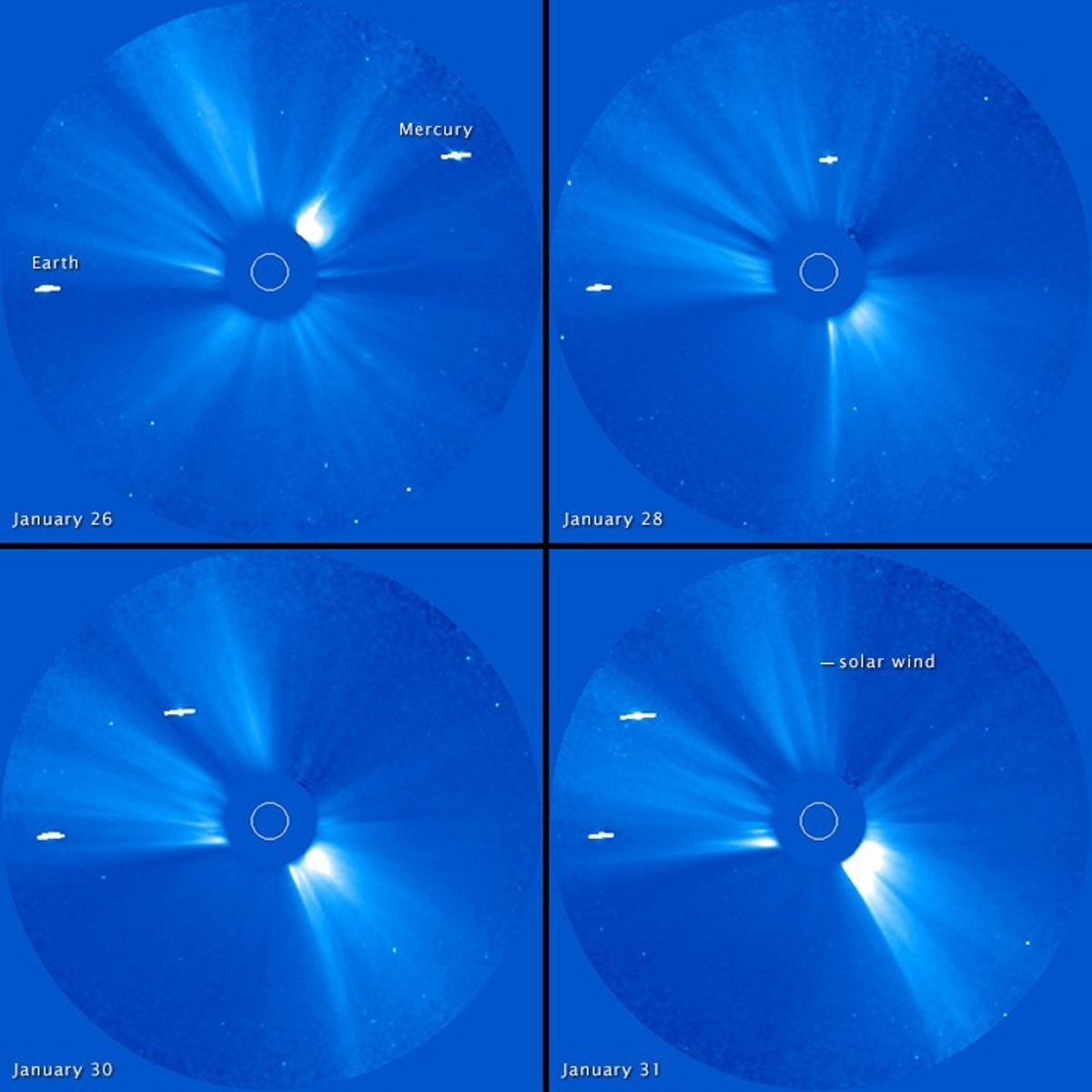 Las líneas horizontales a través de cada planeta son debidas a los fotones adicionales que golpean el detector CCD, ya que la Tierra y Mercurio son mucho más brillantes que las características para las que el coronógrafo fue diseñado. Algunas estrellas de la Vía Láctea también son visibles en el fondo. Bocanadas débiles de viento solar y serpentinas coronales se extienden desde el disco solar en todas las direcciones, pero sobre todo de la parte superior izquierda e inferior derecha. El 31 de enero, una posible erupción de material solar aparece en el cuadrante inferior derecho.