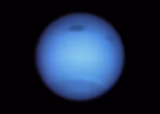 Esta instantánea del telescopio espacial Hubble del dinámico planeta verde azulado Neptuno revela una monstruosa tormenta oscura (centro superior) y la aparición de un punto oscuro más pequeño cercano (superior derecha). - NASA, ESA, STSCI