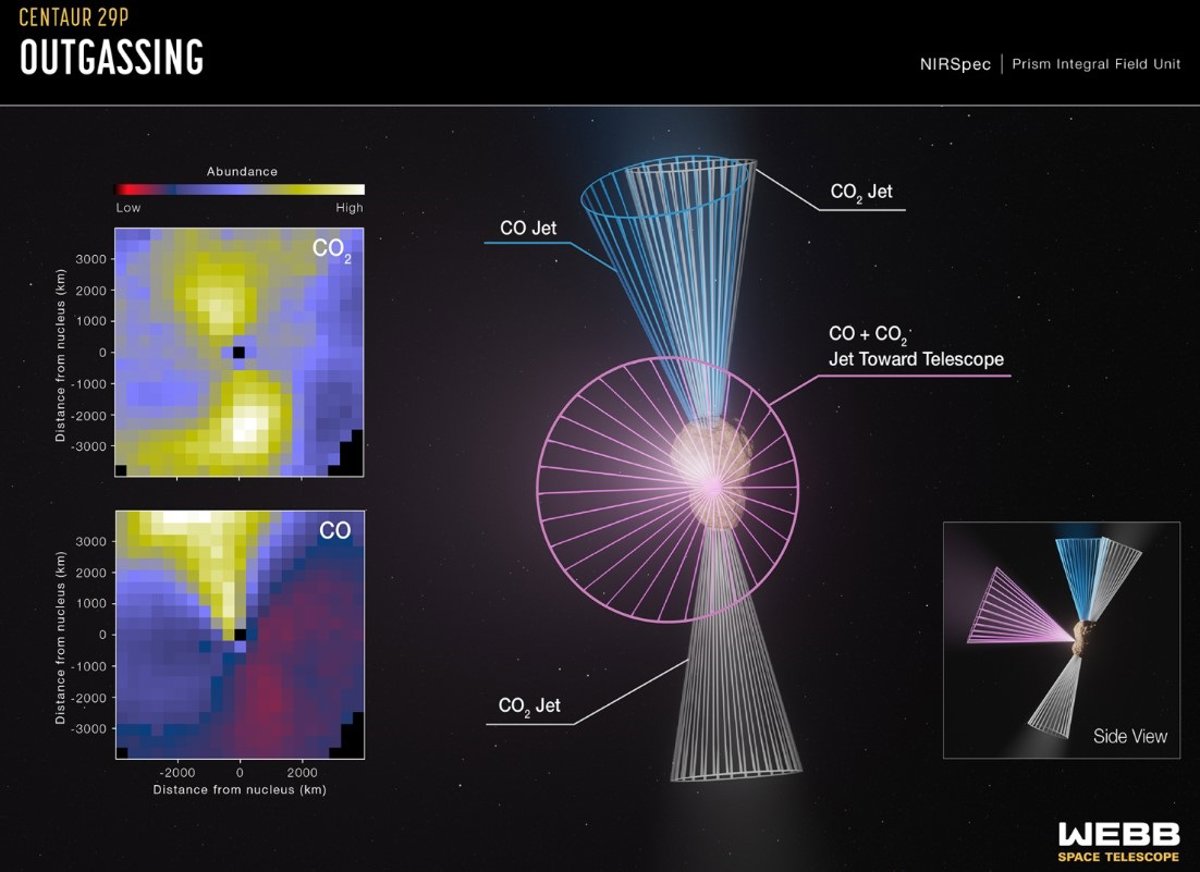 Un equipo de científicos utilizó recientemente el instrumento NIRSpec (espectrógrafo de infrarrojo cercano) del Webb para obtener datos sobre el centauro 29P/Schwassmann-Wachmann 1 (29P para abreviar), un objeto conocido por sus estallidos de alta actividad y cuasi periódicos. Varía en intensidad cada seis u ocho semanas, lo que lo convierte en uno de los objetos más activos del sistema solar exterior. Descubrieron un nuevo chorro de monóxido de carbono (CO) y chorros nunca antes vistos de dióxido de carbono (CO2), que brindan nuevas pistas sobre la naturaleza del núcleo del centauro.