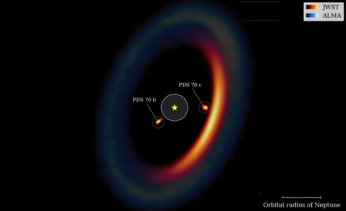Las observaciones del JWST confirmaron la presencia de dos planetas gigantes que todavía están en proceso de formación. Estos planetas están absorbiendo material del disco, de forma muy similar a como los niños toman bloques de construcción para construir una torre. Los investigadores midieron la luz de los planetas en el infrarrojo medio utilizando el instrumento NIRISS del JWST y determinaron que ambos planetas parecen estar acumulando gas, una fase crítica en su desarrollo. Las fuertes firmas de detección de PDS 70 b y PDS 70 c permitieron mediciones precisas de su brillo y ubicación.