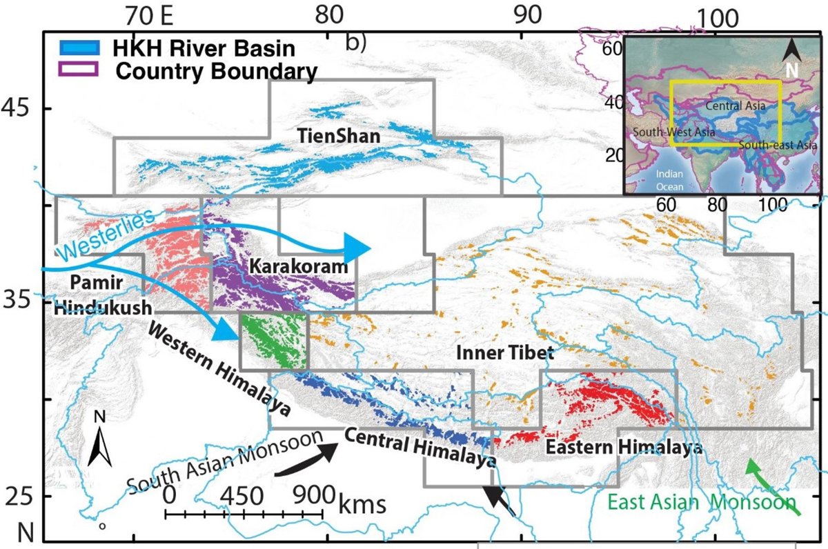 Ubicación del área de estudio en la alta montaña de Asia y límites de las principales cuencas de drenaje (contornos azules). - EDITED FROM SHERPA & WERTH (2025) IEEE