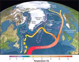 Cuando la corriente es más rápida, más agua tropical cálida y salada viaja hacia el Atlántico Norte. Con el paso de los años, esto hace que se derritan más glaciares y, finalmente, el agua dulce hace que el agua de la superficie sea más liviana y menos propensa a hundirse, lo que ralentiza la corriente.