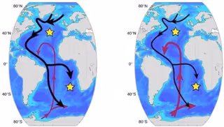 Los científicos se centraron en un sistema de corrientes llamado circulación de vuelco meridional del Atlántico (AMOC), fluyendo hacia el norte cerca de la superficie, que transporta agua cálida y salada desde el ecuador hasta las latitudes cercanas a Groenlandia y el norte de Europa. Aquí, golpea el agua más fría del Ártico, se vuelve más densa y se hunde en el abismo, llevando consigo grandes cantidades de carbono absorbido de la atmósfera. Las aguas profundas luego vuelven en círculos hacia el sur, donde gran parte de ellas se vuelven a fusionar en el Océano Austral para liberar el carbono al aire. El viaje tiene lugar durante décadas a siglos.