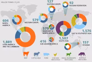 Las emisiones de gases de efecto invernadero de la producción ganadera varían mucho en diferentes partes del mundo debido a las prácticas agrícolas, así como al número, tipo y producto alimenticio de animales. - FAO