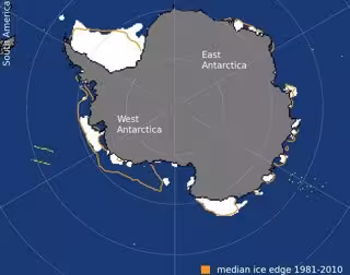 En general, la tendencia a la baja en la extensión mínima anual del hielo marino antártico calculada sobre el registro satelital completo es de 4.700 kilómetros cuadrados por año, o 1,7 por ciento por década en relación con el promedio de 1981 a 2010. Esta tendencia no es estadísticamente significativa. Esto contrasta marcadamente con el Ártico, donde la tendencia en el mínimo de hielo marino es mayor en magnitud y tiene una gran importancia estadística, según el informe del NSIDC.