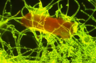 Una partícula de plástico (roja) está colonizada por el hongo marino Parengyodontium - ANNIKA VAKSMAA/NIOZ
