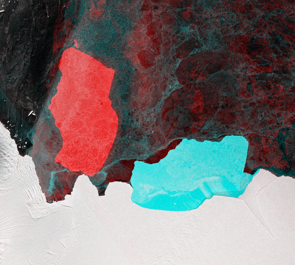 Capturada por la misión Copernicus Sentinel-1 de la ESA, esta imagen multitemporal de colores falsos muestra la ubicación anterior y posterior del iceberg producido por este desprendimiento de la plataforma de hielo antártica, informa la Agencia Espacial Europea.