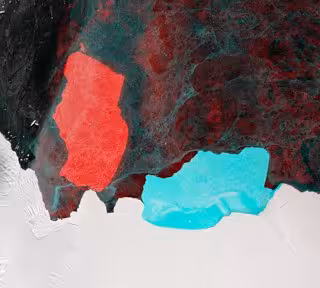 El azul muestra el iceberg antes de la separación, tomado el 20 de septiembre, mientras que el rojo es donde estaba el iceberg el 19 de octubre después del desprendimiento. Se pueden ver pequeños fragmentos rojos del iceberg flotando en las proximidades de D28.