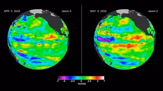Una imagen del 9 de abril de la altura del nivel del mar de la misión satelital de EE.UU/Europa Jason-3 mostró la mayor parte del océano a alturas neutras. Pero a principios de mayo, los altos niveles del mar comenzaron a acumularse en el Pacífico Central. En los trópicos, los niveles altos del mar generalmente son causados por una capa de agua tibia en o debajo de la superficie.