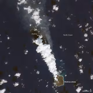 Los vulcanólogos no encuentran signos de que la erupción vaya a mitigarse y esperan que la isla crezca dos o tres veces su tamaño actual. Las cámaras del Landsat 8 capturaron esta imagen de Nishinoshima el 25 de noviembre. La guardia costera japonesa vio por primera vez la isla el 20 de noviembre de 2013.