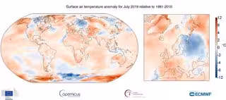 Las mayores anomalías en las temperaturas medias europeas se producen en invierno, cuando los valores pueden variar sustancialmente de un mes a otro. Sin embargo, junio de 2019 fue sustancialmente más cálido que el promedio, en más de 2,3 grados. En contraste, julio de 2019 tuvo una temperatura media europea inferior a 0,1 grados por encima de la norma 1981-2010.