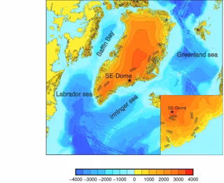 Mapa térmico de Groenlandia que indica las elevaciones de la región. La estrella indica la cúpula sureste de la capa de hielo de Groenlandia, donde se recogió el núcleo de hielo de este estudio. - YUTAKA KUROSAKI, SUMITO MATOBA, ET AL.