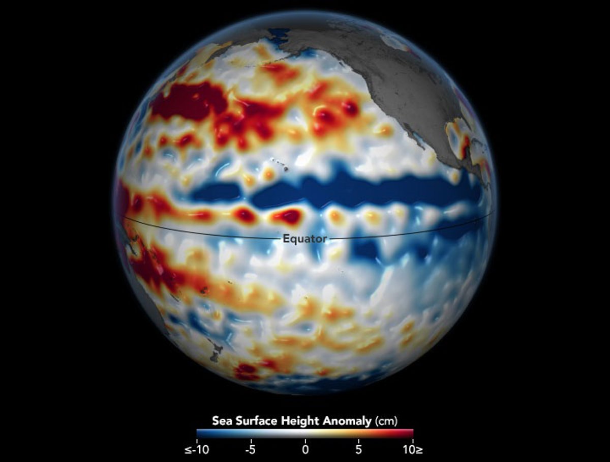 El globo muestra anomalías en la altura de la superficie del mar. Los tonos de azul indican niveles del mar más bajos que el promedio; las condiciones normales del nivel del mar parecen blancas; y los rojos indican áreas donde el océano estaba más alto de lo normal. La expansión y contracción de la superficie del océano es un buen indicador de las temperaturas porque el agua más caliente se expande para llenar más volumen, mientras que el agua más fría se contrae.