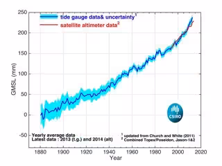 El trabajo, llevada a cabo en el CSIRO de Australia en Hobart, consistió en evaluar los niveles de la tasa de aumentos en el nivel del mar y encontró que había aumentado de 2,2 milímetros por año en 1993 a 3,3 milímetros por año para 2014.