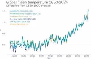 Según el análisis consolidado de la OMM de seis conjuntos de datos, la temperatura media mundial en superficie fue 1,55 °C (con un margen de incertidumbre de +/- 0,13 °C superior a la media de 1850-1900. Esto significa que probablemente acabamos de experimentar el primer año calendario con una temperatura media global de más de 1,5 °C por encima de la media de 1850-1900.