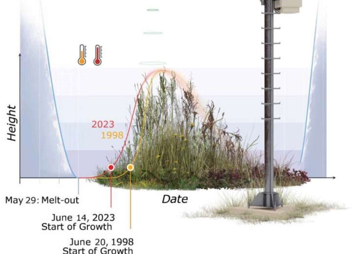 "En promedio, como resultado del cambio climático, la temperatura ambiente es casi dos grados Celsius más cálida tras la desaparición de la capa de nieve que hace 25 años", explica Zehnder. Este rápido calentamiento ha acelerado el inicio del crecimiento de las plantas, acortando así el tiempo desde el final del deshielo hasta que los prados reverdecen.