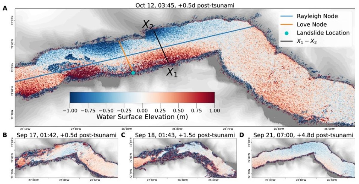 Utilizando datos de KaRIn, los investigadores elaboraron mapas de elevación del fiordo de Groenlandia en varios puntos temporales tras los dos tsunamis. Estos mostraron pendientes claras a través del canal, con diferencias de altura de hasta dos metros. Fundamentalmente, las pendientes en estos mapas se presentaban en direcciones opuestas, lo que demuestra que el agua se movía hacia adelante y hacia atrás a través del canal.