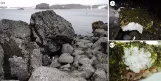 Una gran pieza de espuma de poliestireno, de más de 30 por 30 centímetros y 5 de espesor y cubierta por microalgas, musgos, líquenes y microfauna fue encontrada en un campo caído a lo largo de las costas de la península de Fildes, en la antártica Isla Rey Jorge.