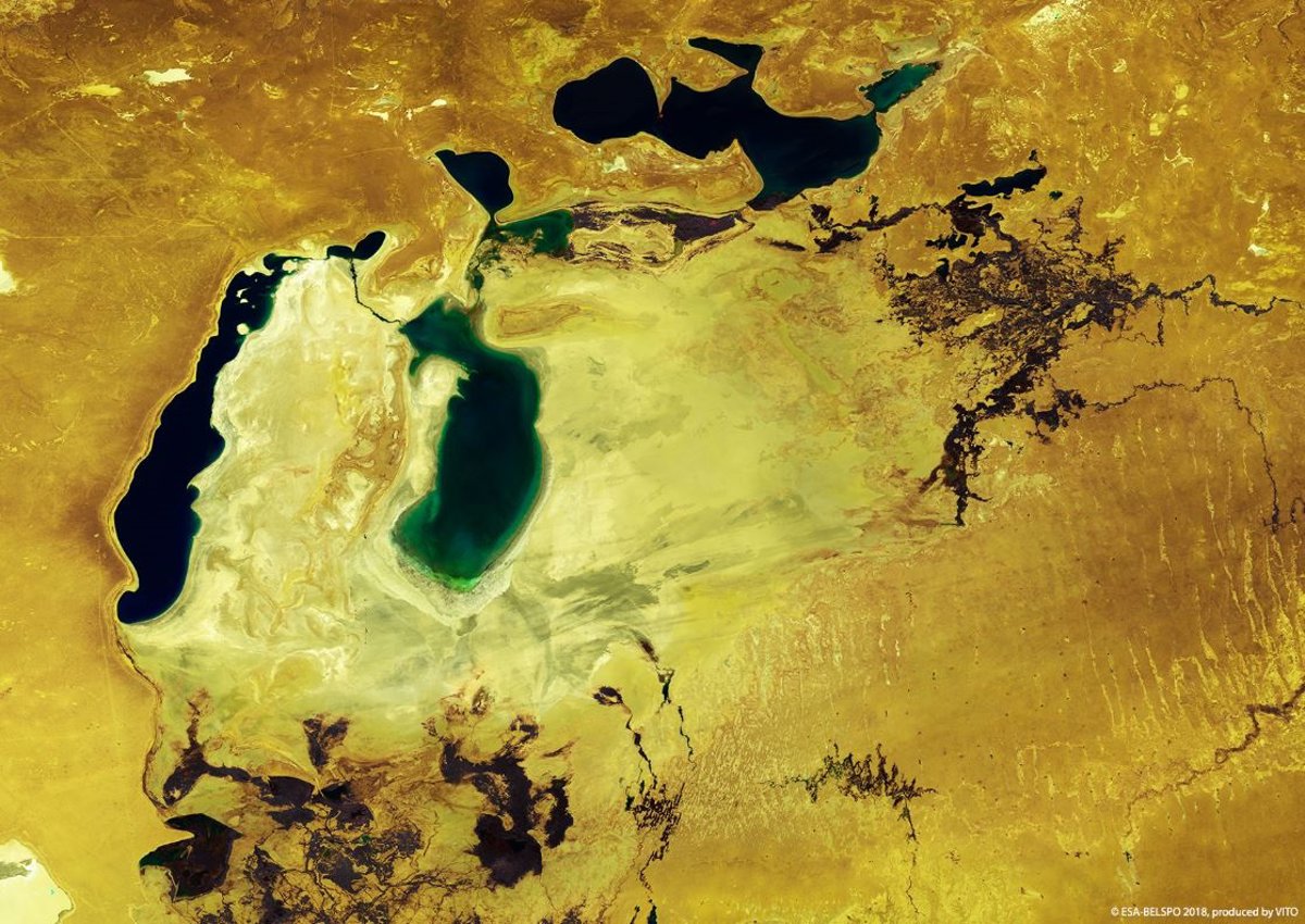 Esta vista del satélite Proba-V de la ESA muestra todo lo que queda del mar de Aral, que una vez fue el cuarto lago más grande del mundo y hoy escenario de un grave desastre ecológico.