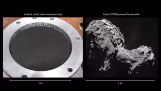 El investigador de la Universidad de Grenoble Oliver Poch y sus colegas utilizaron experimentos de laboratorio para simular varias composiciones posibles de la superficie del cometa y midieron sus espectros de reflectancia resultantes, intentando reproducir la característica de 3,2 micrómetros observada en el cometa 67P.