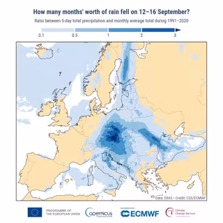 Relación entre la precipitación total de 5 días entre el 12 y el 16 de septiembre de 2024 y la precipitación total promedio mensual en todos los meses durante el período de referencia 1991-2020. - SERVICIO DE CAMBIO CLIMÁTICO DE COPERNICUS/ECMWF