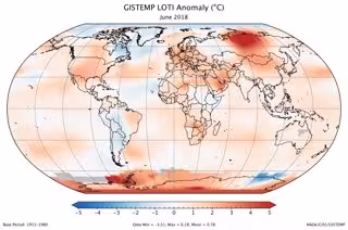 Según el análisis mensual de las temperaturas globales realizado por científicos del Instituto Goddard de Estudios Espaciales (GISS) de la NASA en Nueva York, se vinculó con junio de 1998 como el tercer junio más cálido en 138 años de mantenimiento de registros modernos, solo superado por junio de 2015 y 2016 (+ 0,80 y + 0,79 grados Celsius, respectivamente).