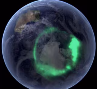 Los iones cargados que interactúan con el campo magnético de la Tierra a menudo crean auroras cerca de los polos del planeta. La aurora australis o las luces del sur son capturadas aquí por un satélite de la NASA. - NASA EARTH OBSERVATORY.