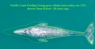 El Laboratorio de Ecología Geoespacial de la Megafauna Marina (GEMM) del Instituto de Mamíferos Marinos ha estado estudiando este subgrupo de ballenas grises desde 2016, incluso volando drones sobre las ballenas para medir su tamaño. Utilizando imágenes de 130 ballenas individuales con edad conocida o estimada entre 2016 y 2022, los investigadores determinaron que se espera que una ballena gris adulta nacida en 2020 alcance una longitud corporal adulta de 1,65 metros menos que una ballena gris nacida antes de 2000. Para las ballenas grises PCFG que crecen hasta medir entre 13 y 14 metros de largo en la madurez completa, eso representa una pérdida de más del 13% de su longitud total.