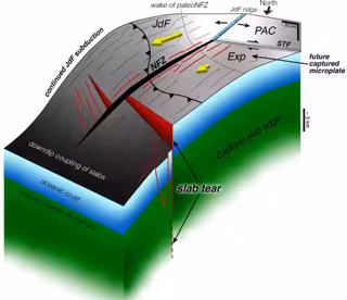 El equipo observó desgarros que atravesaban la placa Juan de Fuca, incluyendo una ruptura masiva donde la placa descendió unos cinco kilómetros. "Hay una falla muy grande que está rompiendo activamente la placa [en subducción]", explicó Shuck. "Aún no está completamente desgarrada, pero está cerca". Los registros sísmicos confirman el patrón: a lo largo del desgarro de 75 kilómetros de longitud, algunas secciones aún presentan actividad sísmica, mientras que otras presentan un silencio inquietante. "Una vez que un fragmento se ha desprendido por completo, ya no produce terremotos porque las rocas ya no están adheridas", explicó. Esa brecha de sismicidad ausente es una señal reveladora de que parte de la placa ya se ha desprendido y que la brecha está creciendo lentamente con el tiempo.