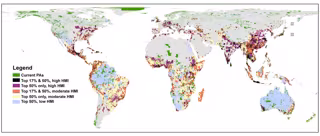 El mapa mundial muestra hasta qué punto las áreas protegidas (AP) actuales y las áreas de máxima prioridad para los objetivos de protección del 17 % y el 50 % están siendo presionadas por las actividades humanas. - WEN-YONG GUO