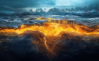 Ilustración conceptual de una sección transversal de una zona de subducción volcánica. La imagen muestra magma ascendiendo desde el manto de la Tierra, rico en un tono dorado brillante que representa depósitos enriquecidos en oro. - NICOLE SMITH/ MIDJOURNEY