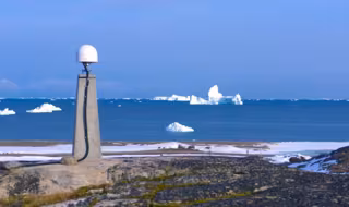 Los cambios en la elevación del suelo se miden mediante sistemas globales de navegación por satélite (GNSS). Esta estación GNSS con icebergs al fondo se encuentra en Groenlandia. - Maaike Weerdesteijn