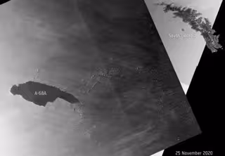 La última imagen de la misión Copernicus Sentinel-1, capturada el 25 de noviembre, muestra que el extremo oriental del témpano está ahora a solo 255 kilómetros de Georgia del Sur. Asimismo muestraa que el témpano está girando y potencialmente a la deriva hacia el oeste, alejando la posibilidad de que llegue a la isla.