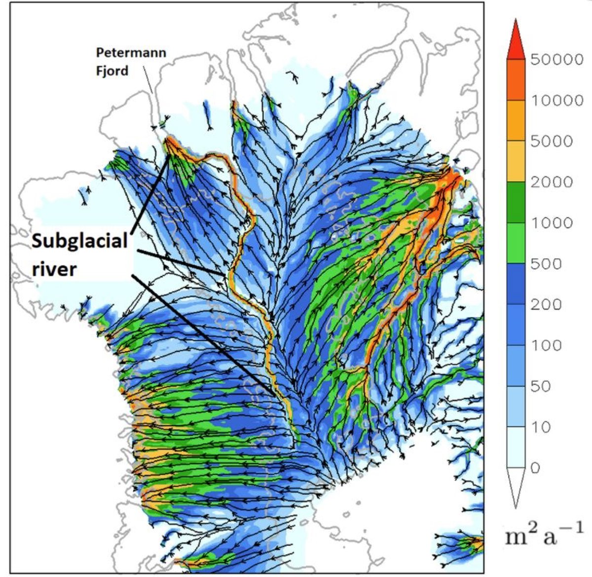 El valle sugerido y el posible río que fluye desde el interior profundo de Groenlandia hasta el fiordo Petermann, muy por debajo de la capa de hielo de Groenlandia - CHRISTOPHER CHAMBERS ET AL, THE CRYOSPHERE