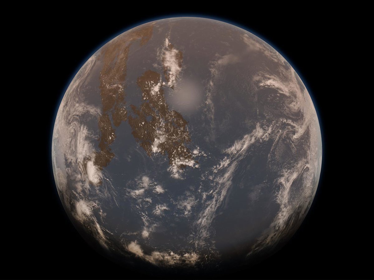 Representación de un artista de la Tierra durante el eón Arcaico, con una atmósfera brumosa, pocas masas de tierra y un océano global. - ALEC BRENNER, HARVARD UNIVERSITY