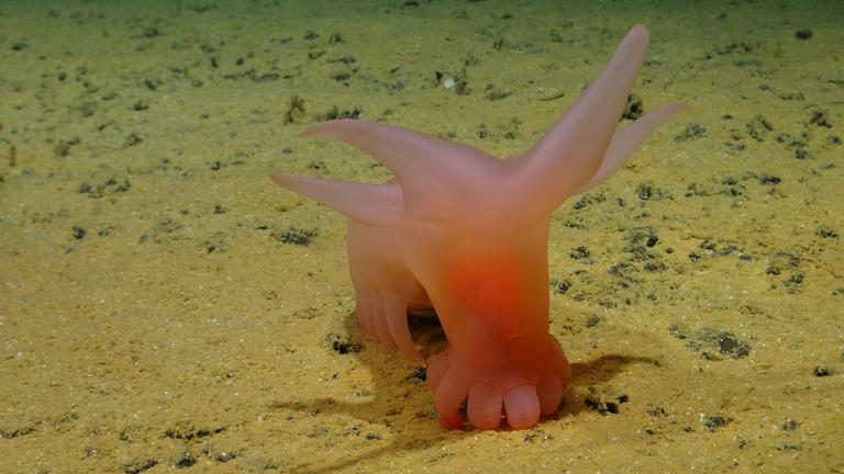 Otra especie descubierta en la expedición fue un cerdo marino rosado, un pepino de mar del género Amperima. La especie se desplaza muy lentamente con sus pies tubulares por las llanuras desoladas en busca de sedimentos ricos en nutrientes. Las excrecencias en el extremo delantero de la parte inferior son pies remodelados que se utilizan para introducir comida en la boca.