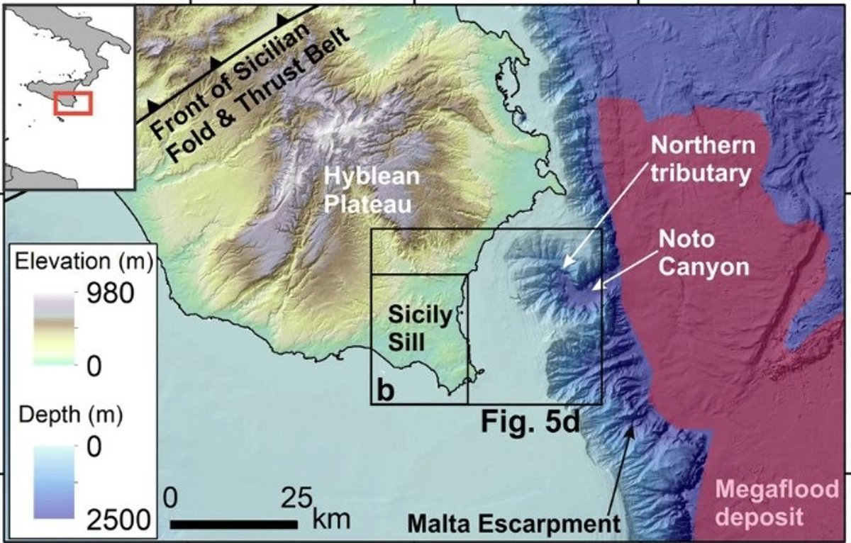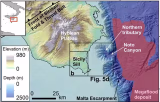La forma y la ubicación del canal sugieren que actuó como un embudo enorme. Cuando las aguas de la megainundación se derramaron sobre el umbral de Sicilia, este canal probablemente llevó el agua hacia el Cañón Noto y hacia el Mediterráneo oriental.