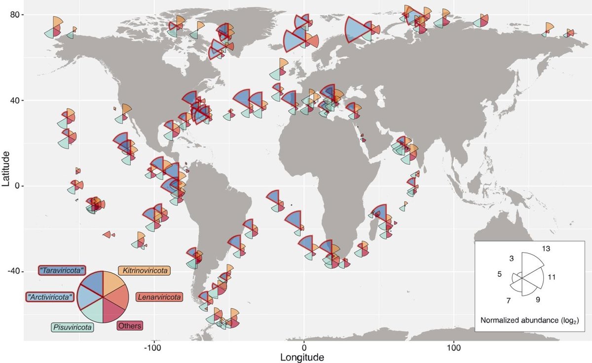 Este mapa muestra la distribución de los virus de ARN en el océano. El tamaño de la cuña es proporcional a la abundancia promedio de virus presentes en esa área, y el color de la cuña indica filos de virus. - ZAYED ET AL., SCIENCE VOLUME 376:156(2022).