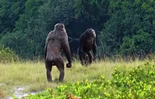 Dos machos adultos de la comunidad Rekambo del Proyecto Chimpancé Loango en Gabón revisando el área. - LCP, LARA M. SOUTHERN