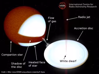Este astrónomo dijo que SS Cygni, en la constelación de Cygnus, el Cisne, es un sistema estelar doble que contiene una estrella roja de baja masa normal y una estrella enana blanca, que se orbitan entre sí en sólo alrededor de 6,6 horas y en una media de una vez cada 49 días, una poderosa explosión ilumina en gran medida el sistema. Una enana blanca es el remanente de una estrella como el Sol que se ha quedado sin combustible y se derrumba en un objeto del tamaño de la Tierra y, como es tan densa, su fuerte gravedad tira gas fuera de su estrella compañera, que luego se arremolina alrededor de la enana blanca.