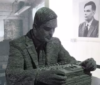 Estatua de Turing y su retrato de fondo. - WIKIPEDIA