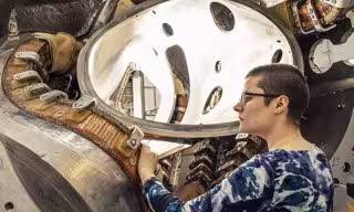 La estudiante de posgrado Alexandra LeViness junto a parte de un estelarator, un dispositivo de fusión retorcido diseñado para confinar plasma ultracaliente para facilitar las reacciones de fusión. - ELLE STARKMAN